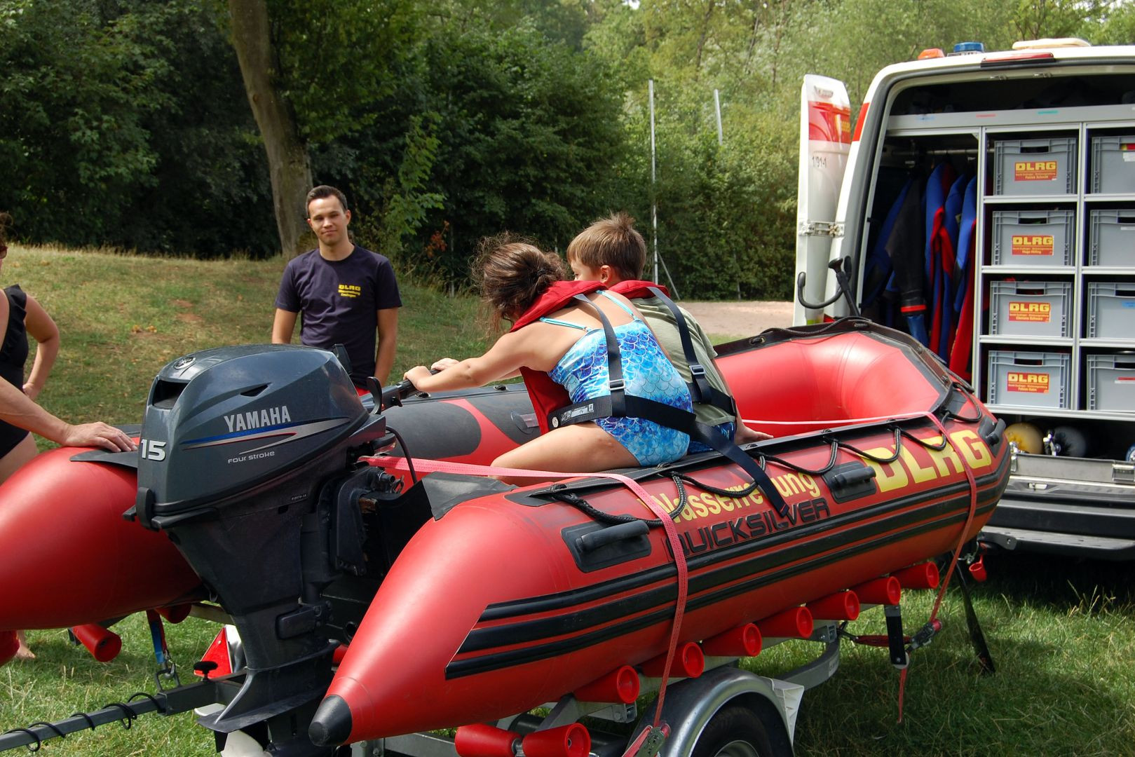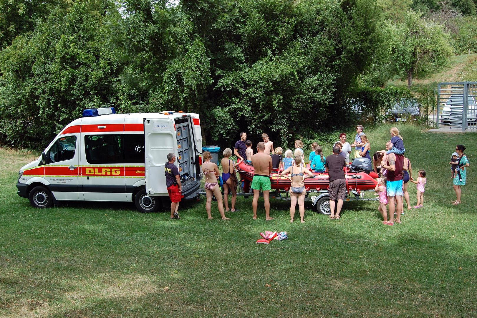 Präsentation Wasserrettungsfahrzeug Am 23.07 waren Mitglieder der DLRG Ortsgruppe Ostfildern-Denkendorf mit einem Fahrzeug des Wasserrettungszuges des Bezirkes Esslingen mit Besatzung im Freibad. Wir konnten bei einer Vorführung im Springerbecken verschiedene Rettungsgeräte zeigen und vorführen, wie eine Rettung einer Person ablaufen kann. Unter anderem wurde auch die Handhabung unseres neuen Rettungsbrettes demonstriert. Nach den Vorführungen konnten sich die interessierten Badegäste an verschiedenen Stationen selbst einen Eindruck von der Handhabung von Wurfsack und Rettungsball verschaffen. Das Einsatzfahrzeug mit Rettungsboot fand großes Interesse und wir konnten viele Fragen der interessierten Gäste über unsere ehrenamtliche Tätigkeit im Wasserrettungsdienst beantworten. Wir danken allen Helfern und den interessierten Badegästen für das rege Interesse. Ihre Leitung Einsatz der Ortsgruppe Ostfildern Denkendorf.